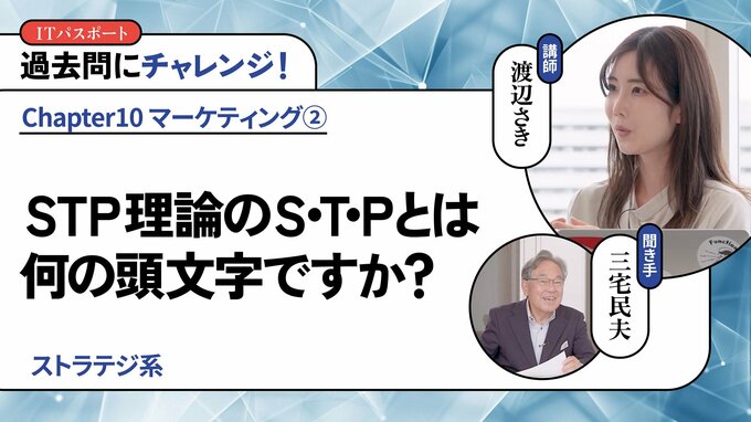 第120話 2026/1/26 ◎過去問にチャレンジ! 【ストラテジ系】STP理論のS・T・Pとは何の頭文字ですか? 技のアップグレード 動画 デジタルスキル・DX STP理論とは、企画や製品・サービスを検討するときに役立つフレームワークです。 渡辺 さき 情報学講師 すきまデザイン代表。東京都立大学理学部化学科卒業後、リクルートに入社し、6年半マーケティング職に従事した。東進ハイスクール講師(ITパスポート試験、高校情報科)。YouTube「ITすきま教室」や、フリーナレーターとしてイベント、展示会でも活躍中。 本編の一部公開版