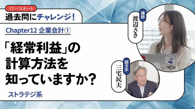 第127話 2026/2/9 ◎過去問にチャレンジ! 【ストラテジ系】「経常利益」の計算方法を知っていますか? 技のアップグレード 動画 デジタルスキル・DX 「経常利益」とは、営業利益から営業外利益を足し、営業外費用を差し引いたものです。「けいつね」と呼ばれることもあります。 渡辺 さき 情報学講師 すきまデザイン代表。東京都立大学理学部化学科卒業後、リクルートに入社し、6年半マーケティング職に従事した。東進ハイスクール講師(ITパスポート試験、高校情報科)。YouTube「ITすきま教室」や、フリーナレーターとしてイベント、展示会でも活躍中。 本編の一部公開版