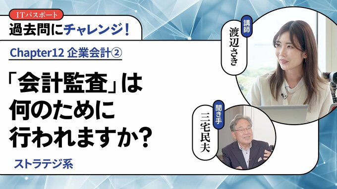 第128話 2026/2/9 ◎過去問にチャレンジ! 【ストラテジ系】「会計監査」は何のために行われますか? 技のアップグレード 動画 デジタルスキル・DX 会計監査とは、企業の財務諸表が正確で信頼性があるかを評価する業務です。会計監査では、監査人が企業の財務諸表を調べます。 渡辺 さき 情報学講師 すきまデザイン代表。東京都立大学理学部化学科卒業後、リクルートに入社し、6年半マーケティング職に従事した。東進ハイスクール講師(ITパスポート試験、高校情報科)。YouTube「ITすきま教室」や、フリーナレーターとしてイベント、展示会でも活躍中。 本編の一部公開版