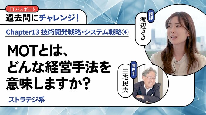 第134話 2026/2/23 ◎過去問にチャレンジ! 【ストラテジ系】MOTとは、どんな経営手法を意味しますか? 技のアップグレード 動画 デジタルスキル・DX MOT(Management of Technology)とは、研究開発の成果を商品に結びつけ、技術力によって事業利益を伸ばす経営のことです。イノベーションの創出を推進し、技術資産を蓄えることで、競争環境において自社を強化します。 渡辺 さき 情報学講師 すきまデザイン代表。東京都立大学理学部化学科卒業後、リクルートに入社し、6年半マーケティング職に従事した。東進ハイスクール講師(ITパスポート試験、高校情報科)。YouTube「ITすきま教室」や、フリーナレーターとしてイベント、展示会でも活躍中。 本編の一部公開版