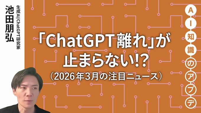 2026/3/13 今月のアップデート 【注目のニュース】「ChatGPT離れ」が止まらない!? 技のアップグレード 動画 無料 デジタルスキル・DX 国内監視と自律型兵器への利用を断固拒否したAnthropic、その契約を引き受けたOpenAI。この判断の違いが、ユーザー数・アプリランキング・人材獲得に劇的な変化を生んでいます。最新のAI勢力図を多角的に読み解きます。 池田 朋弘 生成AI/ChatGPT研究家 Workstyle Evolution代表取締役。早稲田大学卒業後、複数企業を創業。また創業者・経営者として4回のM&Aを経験。著書に『ChatGPT最強の仕事術』など。 本編