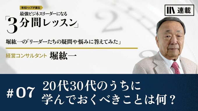 第7話 2023/5/8 月曜朝のエネルギー、レジェンドから見た未来 20代30代のうちに学んでおくべきことは何? 心のアップグレード 3分間レッスン マネジメント リーダーシップ 本連載では、“伝説のトップコンサルタント”堀紘一氏に、メルマガ編集チームがまとめたリーダーたちの悩みをぶつけ、ズバッと斬っていただきます。(2022年4月18日レター) 堀 紘一 経営コンサルタント 1945年、兵庫県生まれ。東京教育大学(現筑波大学)附属駒場高校(筑駒)、東京大学法学部を卒業。読売新聞社、三菱商事を経て、米ハーバード大学ビジネススクールでMBAを首席で卒業。81年、ボストン コンサルティング グループ(BCG)に入社、89年から日本支社社長。2000年6月にドリームインキュベータ(DI)を設立し、社長、会長を歴任。20年6月に取締役を退任。