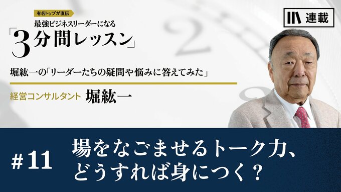 第11話 2023/5/8 月曜朝のエネルギー、レジェンドから見た未来 場をなごませるトーク力、どうすれば身につく? 心のアップグレード 3分間レッスン マネジメント リーダーシップ 本連載では、“伝説のトップコンサルタント”堀紘一氏に、メルマガ編集チームがまとめたリーダーたちの悩みをぶつけ、ズバッと斬っていただきます。(2022年5月23日レター) 堀 紘一 経営コンサルタント 1945年、兵庫県生まれ。東京教育大学(現筑波大学)附属駒場高校(筑駒)、東京大学法学部を卒業。読売新聞社、三菱商事を経て、米ハーバード大学ビジネススクールでMBAを首席で卒業。81年、ボストン コンサルティング グループ(BCG)に入社、89年から日本支社社長。2000年6月にドリームインキュベータ(DI)を設立し、社長、会長を歴任。20年6月に取締役を退任。