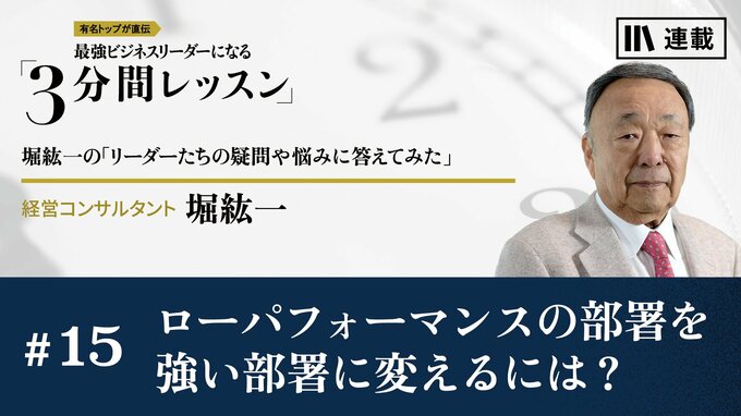 第15話 2023/5/8 月曜朝のエネルギー、レジェンドから見た未来 ローパフォーマンスの部署を強い部署に変えるには? 心のアップグレード 3分間レッスン マネジメント リーダーシップ 本連載では、“伝説のトップコンサルタント”堀紘一氏に、メルマガ編集チームがまとめたリーダーたちの悩みをぶつけ、ズバッと斬っていただきます。(2022年6月20日レター) 堀 紘一 経営コンサルタント 1945年、兵庫県生まれ。東京教育大学(現筑波大学)附属駒場高校(筑駒)、東京大学法学部を卒業。読売新聞社、三菱商事を経て、米ハーバード大学ビジネススクールでMBAを首席で卒業。81年、ボストン コンサルティング グループ(BCG)に入社、89年から日本支社社長。2000年6月にドリームインキュベータ(DI)を設立し、社長、会長を歴任。20年6月に取締役を退任。
