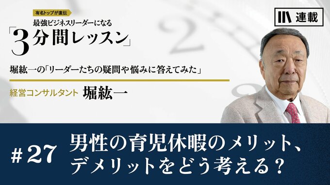 第27話 2023/5/8 月曜朝のエネルギー、レジェンドから見た未来 男性の育児休暇のメリット、デメリットをどう考える? 心のアップグレード 3分間レッスン マネジメント リーダーシップ 本連載では、“伝説のトップコンサルタント”堀紘一氏に、メルマガ編集チームがまとめたリーダーたちの悩みをぶつけ、ズバッと斬っていただきます。(2022年9月19日レター) 堀 紘一 経営コンサルタント 1945年、兵庫県生まれ。東京教育大学(現筑波大学)附属駒場高校(筑駒)、東京大学法学部を卒業。読売新聞社、三菱商事を経て、米ハーバード大学ビジネススクールでMBAを首席で卒業。81年、ボストン コンサルティング グループ(BCG)に入社、89年から日本支社社長。2000年6月にドリームインキュベータ(DI)を設立し、社長、会長を歴任。20年6月に取締役を退任。