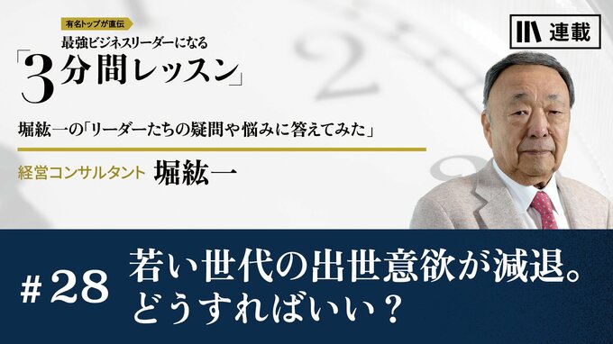 第28話 2023/5/8 月曜朝のエネルギー、レジェンドから見た未来 若い世代の出世意欲が減退。どうすればいい? 心のアップグレード 3分間レッスン マネジメント リーダーシップ 本連載では、“伝説のトップコンサルタント”堀紘一氏に、メルマガ編集チームがまとめたリーダーたちの悩みをぶつけ、ズバッと斬っていただきます。(2022年9月26日レター) 堀 紘一 経営コンサルタント 1945年、兵庫県生まれ。東京教育大学(現筑波大学)附属駒場高校(筑駒)、東京大学法学部を卒業。読売新聞社、三菱商事を経て、米ハーバード大学ビジネススクールでMBAを首席で卒業。81年、ボストン コンサルティング グループ(BCG)に入社、89年から日本支社社長。2000年6月にドリームインキュベータ(DI)を設立し、社長、会長を歴任。20年6月に取締役を退任。