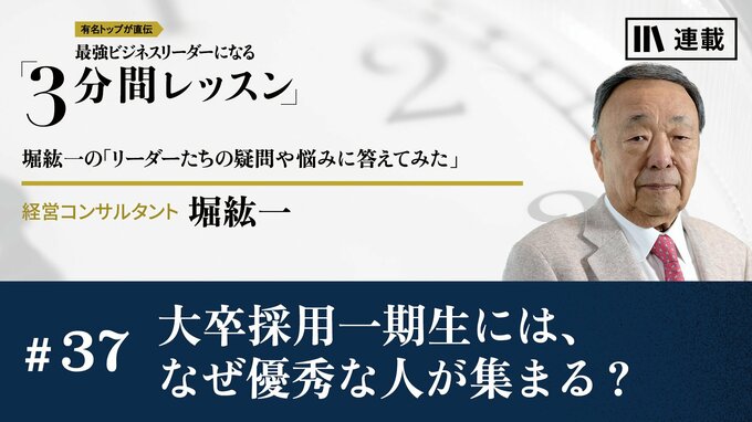 第37話 2023/5/8 月曜朝のエネルギー、レジェンドから見た未来 大卒採用一期生には、なぜ優秀な人が集まる? 心のアップグレード 3分間レッスン マネジメント リーダーシップ 本連載では、“伝説のトップコンサルタント”堀紘一氏に、メルマガ編集チームがまとめたリーダーたちの悩みをぶつけ、ズバッと斬っていただきます。(2022年12月5日レター) 堀 紘一 経営コンサルタント 1945年、兵庫県生まれ。東京教育大学(現筑波大学)附属駒場高校(筑駒)、東京大学法学部を卒業。読売新聞社、三菱商事を経て、米ハーバード大学ビジネススクールでMBAを首席で卒業。81年、ボストン コンサルティング グループ(BCG)に入社、89年から日本支社社長。2000年6月にドリームインキュベータ(DI)を設立し、社長、会長を歴任。20年6月に取締役を退任。
