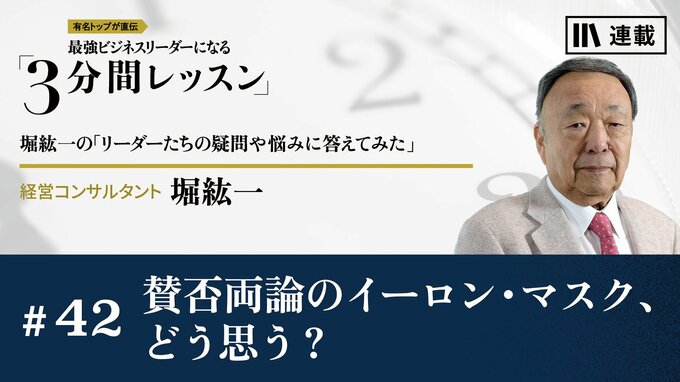 第42話 2023/5/8 月曜朝のエネルギー、レジェンドから見た未来 賛否両論のイーロン・マスク、どう思う? 心のアップグレード 3分間レッスン マネジメント リーダーシップ 本連載では、“伝説のトップコンサルタント”堀紘一氏に、メルマガ編集チームがまとめたリーダーたちの悩みをぶつけ、ズバッと斬っていただきます。(2023年1月16日レター) 堀 紘一 経営コンサルタント 1945年、兵庫県生まれ。東京教育大学(現筑波大学)附属駒場高校(筑駒)、東京大学法学部を卒業。読売新聞社、三菱商事を経て、米ハーバード大学ビジネススクールでMBAを首席で卒業。81年、ボストン コンサルティング グループ(BCG)に入社、89年から日本支社社長。2000年6月にドリームインキュベータ(DI)を設立し、社長、会長を歴任。20年6月に取締役を退任。