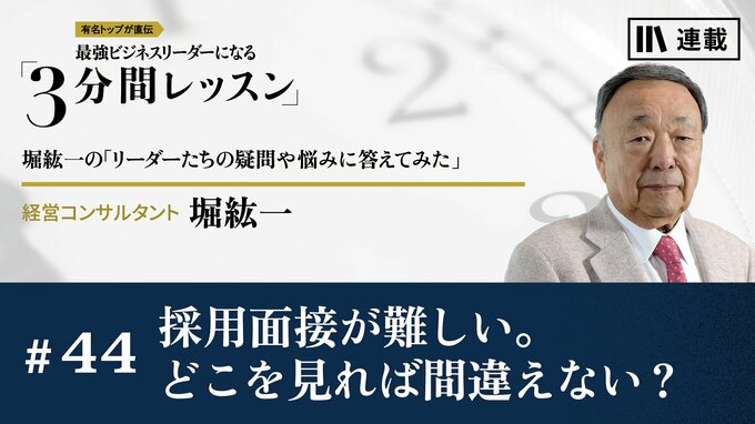 第44話 2023/5/8 月曜朝のエネルギー、レジェンドから見た未来 採用面接が難しい。どこを見れば間違えない? 心のアップグレード 3分間レッスン マネジメント リーダーシップ 本連載では、“伝説のトップコンサルタント”堀紘一氏に、メルマガ編集チームがまとめたリーダーたちの悩みをぶつけ、ズバッと斬っていただきます。(2023年1月30日レター) 堀 紘一 経営コンサルタント 1945年、兵庫県生まれ。東京教育大学(現筑波大学)附属駒場高校(筑駒)、東京大学法学部を卒業。読売新聞社、三菱商事を経て、米ハーバード大学ビジネススクールでMBAを首席で卒業。81年、ボストン コンサルティング グループ(BCG)に入社、89年から日本支社社長。2000年6月にドリームインキュベータ(DI)を設立し、社長、会長を歴任。20年6月に取締役を退任。