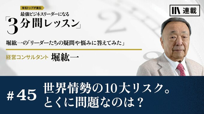 第45話 2023/5/8 月曜朝のエネルギー、レジェンドから見た未来 世界情勢の10大リスク。とくに問題なのは? 心のアップグレード 3分間レッスン マネジメント リーダーシップ 本連載では、“伝説のトップコンサルタント”堀紘一氏に、メルマガ編集チームがまとめたリーダーたちの悩みをぶつけ、ズバッと斬っていただきます。(2023年2月6日レター) 堀 紘一 経営コンサルタント 1945年、兵庫県生まれ。東京教育大学(現筑波大学)附属駒場高校(筑駒)、東京大学法学部を卒業。読売新聞社、三菱商事を経て、米ハーバード大学ビジネススクールでMBAを首席で卒業。81年、ボストン コンサルティング グループ(BCG)に入社、89年から日本支社社長。2000年6月にドリームインキュベータ(DI)を設立し、社長、会長を歴任。20年6月に取締役を退任。
