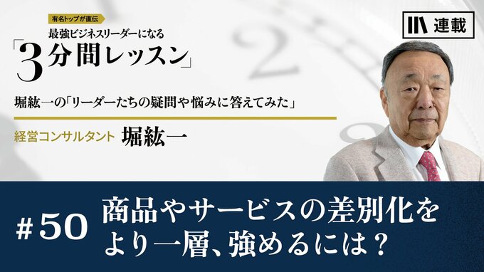 第50話 2023/5/8 月曜朝のエネルギー、レジェンドから見た未来 商品やサービスの差別化をより一層、強めるには? 心のアップグレード 3分間レッスン マネジメント リーダーシップ 本連載では、“伝説のトップコンサルタント”堀紘一氏に、メルマガ編集チームがまとめたリーダーたちの悩みをぶつけ、ズバッと斬っていただきます。(2023年3月13日レター) 堀 紘一 経営コンサルタント 1945年、兵庫県生まれ。東京教育大学(現筑波大学)附属駒場高校(筑駒)、東京大学法学部を卒業。読売新聞社、三菱商事を経て、米ハーバード大学ビジネススクールでMBAを首席で卒業。81年、ボストン コンサルティング グループ(BCG)に入社、89年から日本支社社長。2000年6月にドリームインキュベータ(DI)を設立し、社長、会長を歴任。20年6月に取締役を退任。