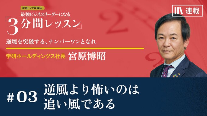 第3話 2023/5/8 月曜朝のエネルギー、全4回のレター 逆風より怖いのは追い風である 心のアップグレード 3分間レッスン マネジメント リーダーシップ 超一流のビジネスリーダーになるためには、逆境に立たされたときよりも、好調なときの動き方が重要です。追い風が吹くときに、リーダーはどのようにビジネスを進めるべきか? 宮原社長の仕事哲学とは何か?(2023年4月17日レター) 宮原 博昭 学研ホールディングス社長、学研ホールディングス代表取締役社長 防衛大学卒業後、貿易会社を経て86年学習研究社(現・学研ホールディングス)入社。学研エデュケーショナル、学研教育出版の社長を経て、2010年より現職。13期連続増収、8期連続増収を達成し、学研ホールディングスをV字回復させた。(2023年4月配信時)
