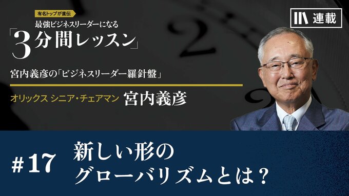 第17話 2023/5/8 月曜朝のエネルギー、レジェンドから見た未来 新しい形のグローバリズムとは? 心のアップグレード リーダーシップ マネジメント 3分間レッスン 2021年は、世界的な枠組みが変化する年といわれる。「辛丑(かのとうし)」の年は、艱難辛苦が起きるかわりに、大きな希望も芽生えるという。ビジネスリーダーは、この変化の流れをどのようにとらえればよいだろうか――。(2021年1月4日レター) 宮内 義彦 オリックス シニア・チェアマン 1935年神戸市生まれ。58年関西学院大学商学部卒業。60年ワシントン大学経営学部大学院でMBA取得後、日綿実業(現双日)入社。64年オリエント・リース(現オリックス)入社。70年取締役、 80年代表取締役社長・グループCEO、 2000年代表取締役会長・グループCEO、14年より現職。 井上 智洋 駒澤大学経済学部准教授 慶應義塾大学環境情報学部卒業。早稲田大学大学院経済学研究科博士課程単位取得退学。経済学博士。2015年より現職。専門はマクロ経済学、貨幣経済理論、成長理論。著書に『人工知能と経済の未来』『人工超知能』『AI時代の新・ベーシックインカム論』『純粋機械化経済 頭脳資本主義と日本の没落』などがある。