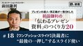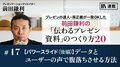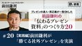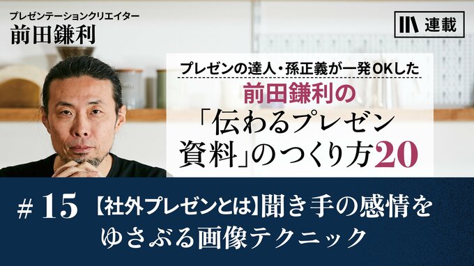 第15話 2023/6/12 社外プレゼン資料のつくり方【応用編】 【社外プレゼンとは】聞き手の感情をゆさぶる画像テクニック 技のアップグレード 動画 プレゼンテーション 社外プレゼンでは、「身内ではない相手」の心を動かさねばなりません。そのためには、より聞き手の印象に残るような応用テクニックを身につける必要があります。もっとも大切なテクニックの「画像制作」から見ていきましょう。 前田 鎌利 プレゼンテーションクリエイター 2010年に孫正義社長(現会長兼社長)の後継者育成機関であるソフトバンクアカデミア第1期生に選考され、初年度第1位を獲得。孫正義社長に直接プレゼンして多くの事業提案を承認されたほか、孫社長のプレゼン資料づくりも担当。その後、ソフトバンク子会社の社外取締役や、ソフトバンク社内認定講師(プレゼンテーション)として活躍。年間200社を超える企業にて講演・研修を行う。著書に『プレゼン資料のデザイン図鑑』『最高品質の会議術』(ともにダイヤモンド社)など。 無料公開版