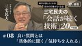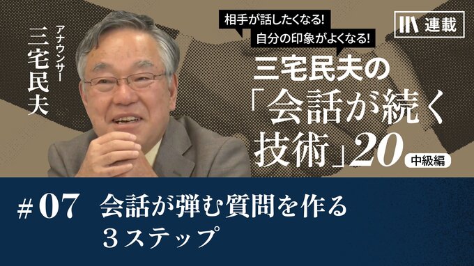 第7話 2023/5/22 中級編 会話が弾む質問を作る3ステップ 技のアップグレード 動画 コミュニケーション 良い質問が来ると相手は答えたくなり、会話がスムーズに続きます。事前にある程度質問を作って、準備しておくのがよいでしょう。実は、質問作りは自分との対話から始まります。良い質問を作る3つのステップについてお話します。 三宅 民夫 アナウンサー 1952年生まれ。75年アナウンサーとしてNHK入局。盛岡、京都放送局勤務を経て、85年に東京アナウンス室へ異動。安定感のあるアナウンス技術と朗らかな雰囲気で、報道からバラエティーまで多彩な番組を担当。『おはよう日本』キャスターや『NHKスペシャル』ナレーション、『日本の、これから』司会などで人気を博す。『紅白歌合戦』総合司会を3度務める。2017年に退職しフリーに。『鶴瓶の家族に乾杯』などを担当。 無料公開版