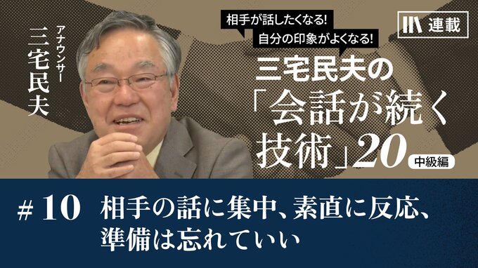 第10話 2023/5/29 中級編 相手の話に集中、素直に反応、準備は忘れていい 技のアップグレード 動画 コミュニケーション これまで事前準備の大切さについてお話してきましたが、本番を迎えて、事前の想定通りに話が進まないことがあります。三宅さんも、テレビのインタビューにおいて何度もそういう場面に遭遇しました。その場合は、相手の話に全集中すればいいのです。なぜでしょうか? 三宅 民夫 アナウンサー 1952年生まれ。75年アナウンサーとしてNHK入局。盛岡、京都放送局勤務を経て、85年に東京アナウンス室へ異動。安定感のあるアナウンス技術と朗らかな雰囲気で、報道からバラエティーまで多彩な番組を担当。『おはよう日本』キャスターや『NHKスペシャル』ナレーション、『日本の、これから』司会などで人気を博す。『紅白歌合戦』総合司会を3度務める。2017年に退職しフリーに。『鶴瓶の家族に乾杯』などを担当。 無料公開版