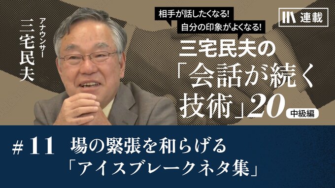 第11話 2023/6/5 中級編 場の緊張を和らげる「アイスブレークネタ集」 技のアップグレード 動画 コミュニケーション 初対面や、立場がある人同士の会話では、最初は自分も相手も緊張しているものです。そんなときはいきなり本題に入らず、お互いの緊張を解く「アイスブレーク」を使いましょう。アイスブレークの話題をどれだけ持っているかが、その後の会話の成否にも関わってきます。 三宅 民夫 アナウンサー 1952年生まれ。75年アナウンサーとしてNHK入局。盛岡、京都放送局勤務を経て、85年に東京アナウンス室へ異動。安定感のあるアナウンス技術と朗らかな雰囲気で、報道からバラエティーまで多彩な番組を担当。『おはよう日本』キャスターや『NHKスペシャル』ナレーション、『日本の、これから』司会などで人気を博す。『紅白歌合戦』総合司会を3度務める。2017年に退職しフリーに。『鶴瓶の家族に乾杯』などを担当。 無料公開版