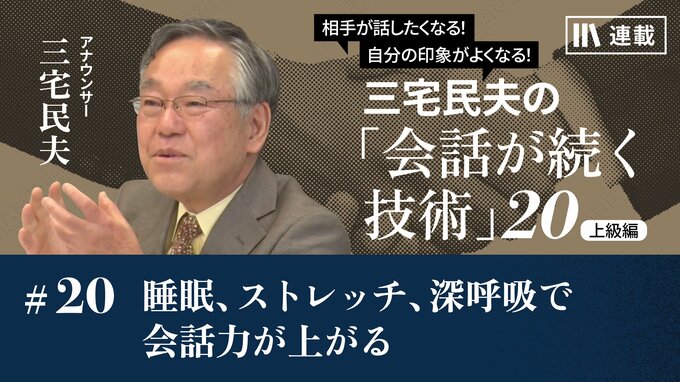 第20話 2023/7/3 上級編 睡眠、ストレッチ、深呼吸で会話力が上がる 技のアップグレード 動画 コミュニケーション 「会話が続く技術」も最終回。前回の話でお分かりの通り、会話は相手について考えることがとても大事です。しかし、自分の心が落ち着いていないと、相手のことを考える余裕が持てません。そこで、三宅さん流「心を落ち着ける方法」についてご紹介します。 三宅 民夫 アナウンサー 1952年生まれ。75年アナウンサーとしてNHK入局。盛岡、京都放送局勤務を経て、85年に東京アナウンス室へ異動。安定感のあるアナウンス技術と朗らかな雰囲気で、報道からバラエティーまで多彩な番組を担当。『おはよう日本』キャスターや『NHKスペシャル』ナレーション、『日本の、これから』司会などで人気を博す。『紅白歌合戦』総合司会を3度務める。2017年に退職しフリーに。『鶴瓶の家族に乾杯』などを担当。 無料公開版