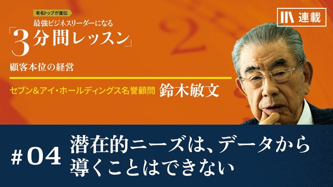 第4話 2023/5/8 月曜朝のエネルギー、全4回のレター 潜在的ニーズは、データから導くことはできない 心のアップグレード 3分間レッスン ビジネス心理 経営論・経営哲学 今回は、「ポストコロナの行動経済学」と題して、消費減少社会を乗り越えるための考え方をお届けします。(2020年9月21日レター) 鈴木 敏文 セブン&アイ・ホールディングス名誉顧問 1932年長野県。中央大学経済学部卒業後、東京出版販売(現トーハン)を経て63年イトーヨーカ堂入社。73年セブン-イレブン・ジャパンを創設し78年社長に就任。92年イトーヨーカ堂社長、2003 年イトーヨーカ堂およびセブン-イレブン・ジャパン会長兼CEO に就任。05年セブン&アイ・ホールディングスを設立し、会長兼 CEOに就任。16年から現職。(2021年9月配信時)