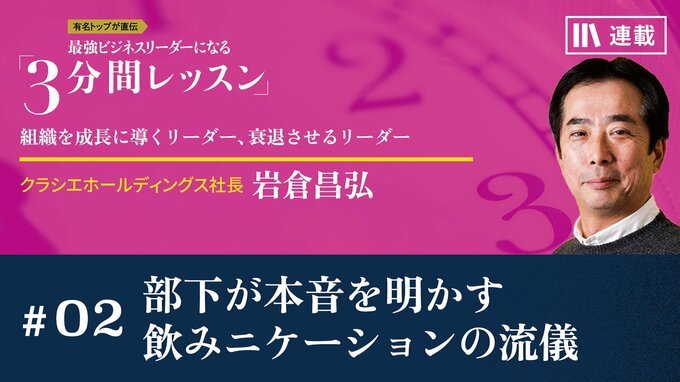 若手をはじめ、部下から敬遠されがちな「会社の飲み会」。本当にいい飲み会とは、部下が積極的に自分の本音を話す絶好のコミュニケーションの機会です。同じ目標を共有し、結果として最高のチームを生み出す“飲みニケーション”とはどのようなものか。旧カネボウ時代を反面教師に、抜群のチームワークを社内で築く方法をクラシエホールディングス・岩倉昌弘社長が公開。(2023年6月12日レター)