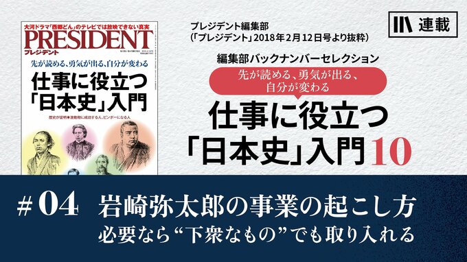 日本三大財閥の中で、最初に名前があがる三菱を一代で築いたのは、岩崎弥太郎。土佐の極貧武士の出だった弥太郎は、たとえ金勘定自体が下衆なものと言われても、いいと思ったものは何でも取り上げた。現代のビジネス界も、その商才と決断力に学ぶものは大きい。