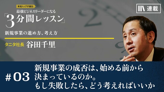 第3話 2023/5/8 月曜朝のエネルギー、全4回のレター 新規事業の成否は、始める前から決まっているのか。もし失敗したら、どう考えればいいか 心のアップグレード 3分間レッスン マネジメント リーダーシップ 失敗しても、下を向いてはいられません。谷田さんが、次の戦いに前向きに向かうためのヒントをくれました。(2020年11月23日レター) 谷田 千里 タニタ代表取締役社長 1972年、大阪府生まれ。佐賀大学理工学部卒業後に船井総合研究所などを経て、2001年タニタ入社。05年タニタアメリカINC取締役、07年タニタ取締役を経て、08年より現職。創業家の三代目。(2020年11月配信時)