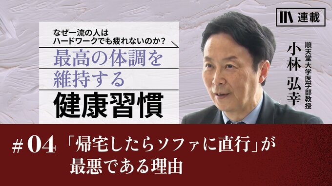 帰宅したら「疲れたー」と言ってソファに座り込むのは最悪の習慣です。「そこであなたの1日は終わってしまう」と小林先生は警告します。実は、「疲れ」とは血流障害のことなので、帰宅したらソファに直行せず、部屋の中で動くことが血流にとって大事なのです。どういうことでしょうか?