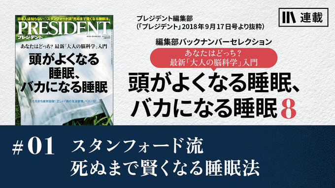 昨年、ベストセラーになった『スタンフォード式 最高の睡眠』(サンマーク出版)。睡眠生体リズムを研究する著者・西野精治氏は、同書で睡眠医学の総本山スタンフォード大学をはじめとする最新の睡眠研究の知見を紹介している。曰く、すでに一流のアスリートは睡眠の重要性を理解しベストパフォーマンスを出し、そのノウハウはビジネスにも応用できる。「睡眠時間を削ってでも仕事に邁進すること」が、いかに人体にも仕事の効率にも悪影響を及ぼすかを西野氏は論理的に説いている。