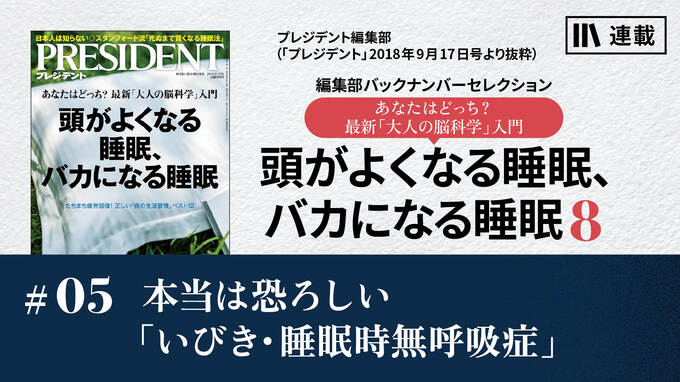 いびきは、本人に自覚症状がないことが多いうえに、家族に指摘されても「いびきなんてみんなかいているから」と、深刻にとらえない人が多い。しかし、東京医科歯科大学の教授で同大学快眠センター長の宮崎泰成氏は、「ありふれているからと放置する人が多いが、QOL(生活の質)や仕事のパフォーマンスに影響するばかりか、深刻な病気が隠れている可能性が高い。とにかく早めに病院に行ってほしい」と強調する。