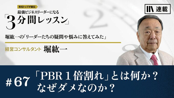 第67話 2023/7/24 月曜朝のエネルギー、レジェンドから見た未来 「PBR1倍割れ」とは何か?なぜダメなのか? 心のアップグレード 3分間レッスン マネジメント リーダーシップ 本連載では、“伝説のトップコンサルタント”堀紘一氏に、メルマガ編集チームがまとめたリーダーたちの悩みをぶつけ、ズバッと斬っていただきます。(2023年7月24日レター) 堀 紘一 経営コンサルタント 1945年、兵庫県生まれ。東京教育大学(現筑波大学)附属駒場高校(筑駒)、東京大学法学部を卒業。読売新聞社、三菱商事を経て、米ハーバード大学ビジネススクールでMBAを首席で卒業。81年、ボストン コンサルティング グループ(BCG)に入社、89年から日本支社社長。2000年6月にドリームインキュベータ(DI)を設立し、社長、会長を歴任。20年6月に取締役を退任。
