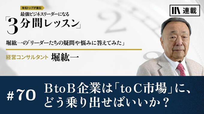 第70話 2023/8/14 月曜朝のエネルギー、レジェンドから見た未来 BtoB企業は「toC市場」に、どう乗り出せばいいか? 心のアップグレード 3分間レッスン マネジメント リーダーシップ 本連載では、“伝説のトップコンサルタント”堀紘一氏に、メルマガ編集チームがまとめたリーダーたちの悩みをぶつけ、ズバッと斬っていただきます。(2023年8月14日レター) 堀 紘一 経営コンサルタント 1945年、兵庫県生まれ。東京教育大学(現筑波大学)附属駒場高校(筑駒)、東京大学法学部を卒業。読売新聞社、三菱商事を経て、米ハーバード大学ビジネススクールでMBAを首席で卒業。81年、ボストン コンサルティング グループ(BCG)に入社、89年から日本支社社長。2000年6月にドリームインキュベータ(DI)を設立し、社長、会長を歴任。20年6月に取締役を退任。