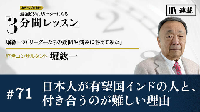 第71話 2023/8/21 月曜朝のエネルギー、レジェンドから見た未来 日本人が有望国インドの人と、付き合うのが難しい理由 心のアップグレード 3分間レッスン マネジメント リーダーシップ 本連載では、“伝説のトップコンサルタント”堀紘一氏に、メルマガ編集チームがまとめたリーダーたちの悩みをぶつけ、ズバッと斬っていただきます。(2023年8月21日レター) 堀 紘一 経営コンサルタント 1945年、兵庫県生まれ。東京教育大学(現筑波大学)附属駒場高校(筑駒)、東京大学法学部を卒業。読売新聞社、三菱商事を経て、米ハーバード大学ビジネススクールでMBAを首席で卒業。81年、ボストン コンサルティング グループ(BCG)に入社、89年から日本支社社長。2000年6月にドリームインキュベータ(DI)を設立し、社長、会長を歴任。20年6月に取締役を退任。