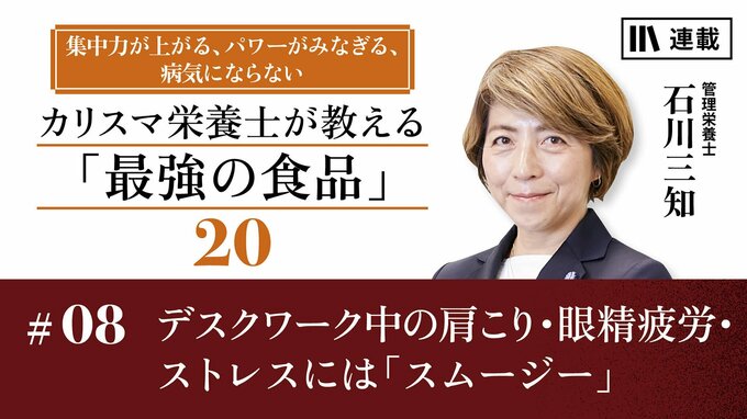 イスに座って長時間作業をしていると、肩や首、腰などがこわばり、こりや痛みが生じてきます。目が充血したりかすんだりすることもあるでしょう。さらに、最近では素早いレスポンスを求められるチャットにストレスを感じる人も増えているようです。デスクワーク中、こうした症状を感じたときにぜひ試してほしいのが「スムージー」。症状に応じた3つのレシピを紹介します。