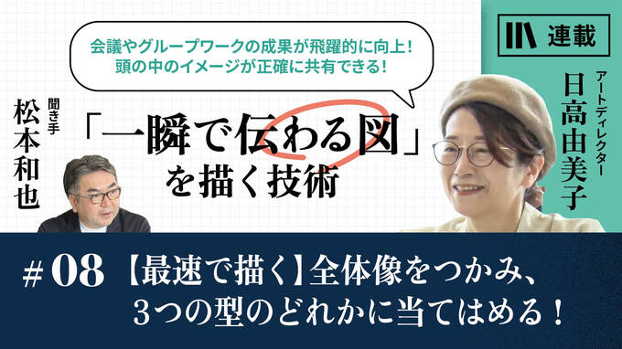 たとえば会議のとき、サッとホワイトボードに議論の内容を図解して見せると、周囲から感心されます。仕事で図を描く際は、スピード感が大事になります。コツは全体像をつかむ→図解の型にあてはめる、という流れを取ること。図解の型は3つあり、どれかに当てはめることができます。