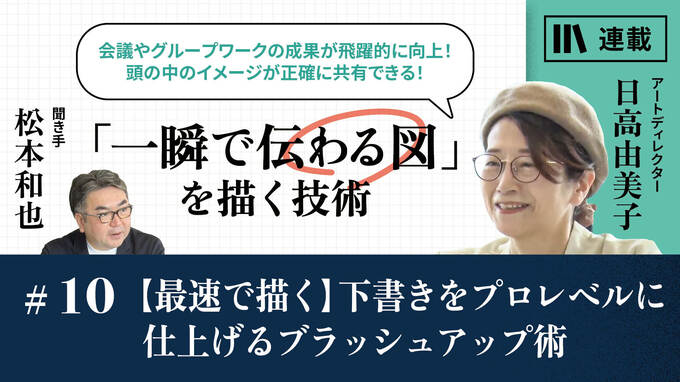 第10話 2023/10/2 【初級編】パーツを活用する、情報を整理する 【最速で描く】下書きをプロレベルに仕上げるブラッシュアップ術 技のアップグレード 動画 書き方 プレゼンテーション コミュニケーション 最速で図を描く際は、まず下書きすることを9話でお伝えしました。さて、その下書きを"プロレベル"に仕上げるには、どうすればいいのでしょうか。ブラッシュアップアップのポイントは4つ。今回の練習問題では、下書きのブラッシュアップにトライしましょう。 日高 由美子 アートディレクター 東京学芸大学美術科卒業後、日本デザインセンターイラストカンプ部に就職。その後コーセー化粧品宣伝部、ワーナーミュージック・ジャパン編成デザイン部でグラフィックデザインに従事。1995年より株式会社TAMにてアートディレクターとして勤務。アートディレクターとして複数企業のデザイン顧問を務める。描いて伝えるテクニックを教える「地獄のお絵描き道場」など、セミナー総受講者は4000人を超える。著書に『なんでも図解』。 無料公開版