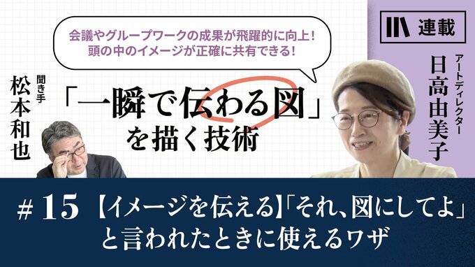 第15話 2023/10/23 【上級編】目的に合わせてアウトプットする 【イメージを伝える】「それ、図にしてよ」と言われたときに使えるワザ 技のアップグレード 動画 書き方 プレゼンテーション コミュニケーション 自分の頭の中にあるイメージを言葉だけではうまく説明できないとき、「それ、図にしてよ」と相手から言われたら、サッと描けますか? これは12話で学んだ「時系列型」を使うと、上手な図が素早く描けます。練習問題を解きながらマスターしましょう。 日高 由美子 アートディレクター 東京学芸大学美術科卒業後、日本デザインセンターイラストカンプ部に就職。その後コーセー化粧品宣伝部、ワーナーミュージック・ジャパン編成デザイン部でグラフィックデザインに従事。1995年より株式会社TAMにてアートディレクターとして勤務。アートディレクターとして複数企業のデザイン顧問を務める。描いて伝えるテクニックを教える「地獄のお絵描き道場」など、セミナー総受講者は4000人を超える。著書に『なんでも図解』。 無料公開版