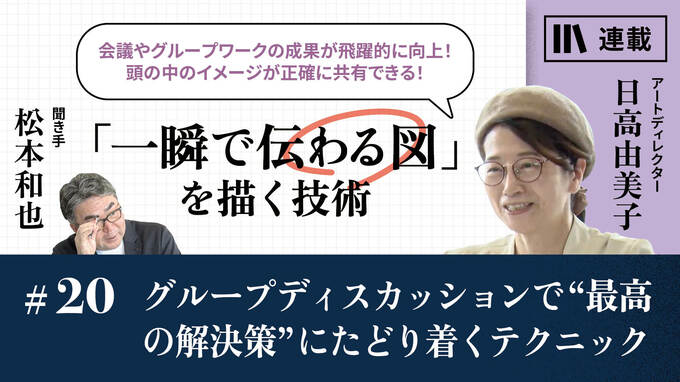 第20話 2023/11/6 【上級編】目的に合わせてアウトプットする グループディスカッションで"最高の解決策"にたどり着くテクニック 技のアップグレード 動画 書き方 プレゼンテーション コミュニケーション ディスカッションが活性化して、アイデアを発散させた後、どうやって絞ればよいか悩みますね。アイデアを整理、検討して"最高の解決策"にたどり着く際も、図解のパワーが助けてくれます。手で描くことで得られるすごい効用を体感してください。 日高 由美子 アートディレクター 東京学芸大学美術科卒業後、日本デザインセンターイラストカンプ部に就職。その後コーセー化粧品宣伝部、ワーナーミュージック・ジャパン編成デザイン部でグラフィックデザインに従事。1995年より株式会社TAMにてアートディレクターとして勤務。アートディレクターとして複数企業のデザイン顧問を務める。描いて伝えるテクニックを教える「地獄のお絵描き道場」など、セミナー総受講者は4000人を超える。著書に『なんでも図解』。 無料公開版