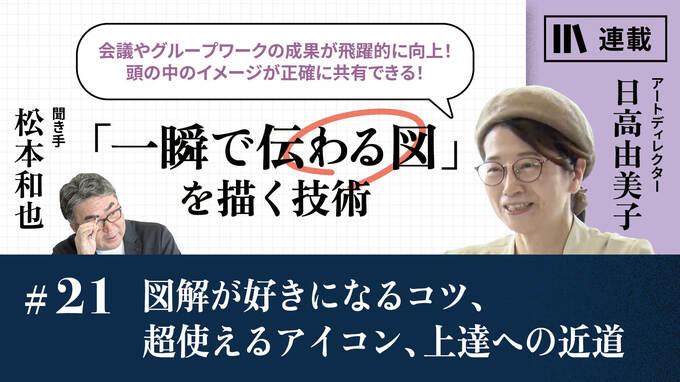 第21話 2023/11/6 【上級編】目的に合わせてアウトプットする 図解が好きになるコツ、超使えるアイコン、上達への近道 技のアップグレード 動画 無料 書き方 プレゼンテーション コミュニケーション 図を描くとは、人前で描いたり、人に見せたりするわけですから、どうしたら上達できるのか、まだまだ知りたいことがあります。トレーニング法、簡単に描けて使えるアイコンの紹介、おススメの道具など――。図を描くことがもっと好きになる番外編。 日高 由美子 アートディレクター 東京学芸大学美術科卒業後、日本デザインセンターイラストカンプ部に就職。その後コーセー化粧品宣伝部、ワーナーミュージック・ジャパン編成デザイン部でグラフィックデザインに従事。1995年より株式会社TAMにてアートディレクターとして勤務。アートディレクターとして複数企業のデザイン顧問を務める。描いて伝えるテクニックを教える「地獄のお絵描き道場」など、セミナー総受講者は4000人を超える。著書に『なんでも図解』。 本編