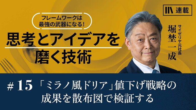 サイゼリヤの人気メニューに「ミラノ風ドリア」があります。いまや店舗あたり平均1日100食、全店では日に10万食が売れるお化け商品です。1999年、サイゼリヤは480円で販売していたこの商品を、290円にまで値下げし、ファミリーレストラン業界を驚かせました。じつはこれは、客数アップを狙った戦略の一環。狙いは、ばっちりあたりました。サイゼリヤが思い切った戦略に打って出られたのには、理由があります。2つの要素の相関関係を表すグラフ、「散布図」を使って解説しましょう。