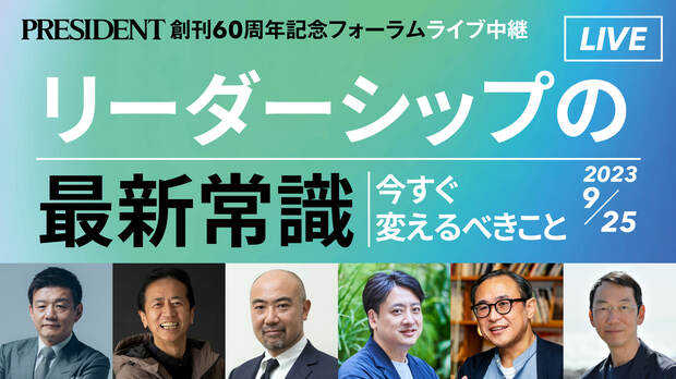 いつもビジネスリーダーのために──。PRESIDENTが創刊以来、大切にしている理念です。変化がめまぐるしい今、昨日までの自分に甘んじず、成長し続ける人こそが、真のリーダーであり、「未来を創る」ことができます。そこで今回、PRESIDENTは創刊60周年を記念し、支えてくださる皆さまに新たな羅針盤をお届けするべく、2023年9月25日(月)~26日(火)に東京国際フォーラムにて「未来創造フェスティバル」を開催いたします。各界を代表する方々による生の熱い講演をお楽しみください!2日間にわたるビジネスパーソン向けプログラムをPRESDIENT Online ACADEMY(プレジデントオンラインアカデミー)で限定ライブ配信することが決定しました。(プレジデントオンラインアカデミー会員の方はログイン後にlive配信を視聴できます)