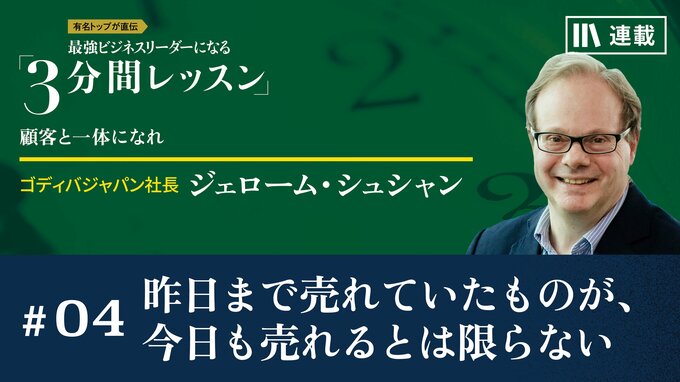 第4話 2023/5/8 月曜朝のエネルギー、全4回のレター 昨日まで売れていたものが、今日も売れるとは限らない 心のアップグレード 3分間レッスン マネジメント リーダーシップ 皆様は、世の中の変化、マーケットの変化にどのくらい敏感ですか。もしかしたら、「変化は常に起きるもの」と口では言いながら、実際の対応が不十分になっていませんか――。シュシャンさんが警鐘を鳴らします。(2021年5月31日レター) ジェローム・シュシャン ゴディバジャパン代表取締役社長 1961年フランス、パリ生まれ。LVMHグループ・ヘネシーのディレクター、リヤドロジャパンの社長などを経て、2010年に現職。7年で業績を3倍に拡大させた。経済同友会において数少ない外国人委員の一人を務めるかたわら、長年にわたり在日ベルギー・ルクセンブルク商工会議所とフランス商工会議所の理事の任務を担う。大学在学中に初来日した際、日本文化に興味を抱き、29歳で弓道を始めた。現在、五段錬士の腕前を誇る。また国際弓道連盟の理事を務め、弓道の国際的な啓蒙活動をサポートしている。(2021年5月配信時)