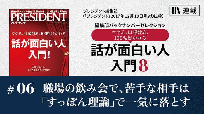 最後に、ギスギスした職場の飲み会を盛り上げる方法をまとめると――。小ボケを打ち続ける。誰かをイジるか自虐ネタで笑いを共有する。手強い相手を「すっぽん理論」で落とす。ここまでやってダメだったら、うーん、もう諦めるしかないな(苦笑)。