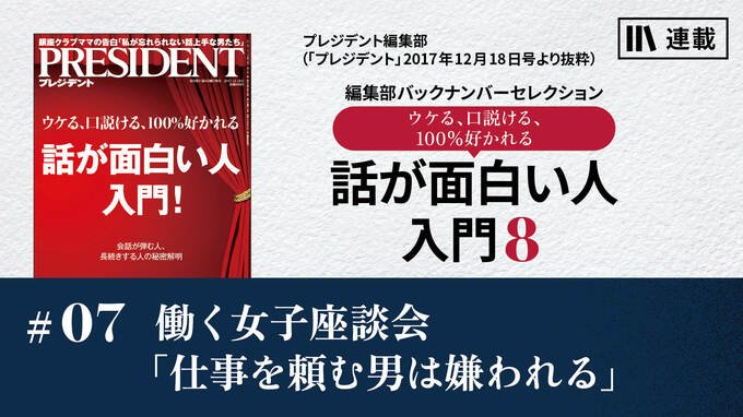 第7話 2023/11/27 話が面白い人入門8 働く女子座談会「仕事を頼む男は嫌われる」 技のアップグレード バックナンバーセレクション コミュニケーション 会社の窓口となり数多くの人と言葉を交わす広報女子。だからこそ見えてくる相手の人間性。どんな男の言い方がアウトなのか?(内容・肩書は、2017年12月18日号掲載時のままです) プレジデント編集部 雑誌は1963年、米国タイム社の経済誌「フォーチュン」提携誌として創刊。ビジネスリーダーの問題解決を編集方針とする。2000年に月刊から月2回刊にリニューアル。創刊60年目の2023年から雑誌編集部によるアカデミー事業運営開始。