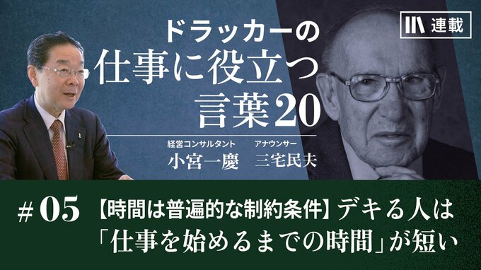 5話目にご紹介する言葉は、「時間は普遍的な制約条件」(『経営者の条件』より)。ドラッカーによると、時間を管理することが何よりも大事だといいます。そして、「成果をあげられない人のほうが多く働いている」となかなか厳しいことも述べています。では、具体的にどうすればいいのでしょうか? 小宮さんがドラッカー流の時間の使い方を伝授します。