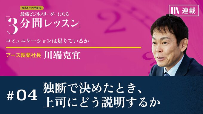 第4話 2023/5/8 月曜朝のエネルギー、全4回のレター 独断で決めたとき、上司にどう説明するか 心のアップグレード 3分間レッスン マネジメント リーダーシップ 川端さんが支店長だったとき、ある新商品の販売戦略について、本部の方針とは違う判断を下したそうです。もちろん、社内への事情説明が必要になってきますが、そのときの姿勢・態度が重要だと言います。(2021年6月28日レター) 川端 克宜 アース製薬株式会社 代表取締役社長CEO、グループ各社取締役会長 1994年入社、2006年広島支店長、11年役員待遇営業本部大阪支店長。13年、取締役ガーデニング戦略本部本部長。14年、代表取締役社長兼ガーデニング戦略本部本部長。15年、代表取締役社長兼マーケティング総合戦略本部本部長。21年より現職。(2021年6月配信時)