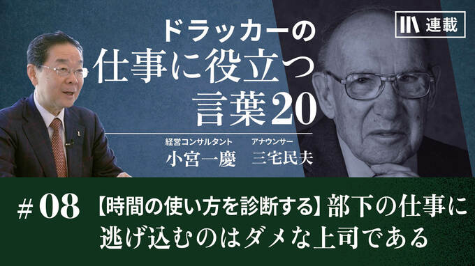 権限委譲という言葉は、間違って使われがち。正しくは、自分にしかできない仕事に集中するために、部下に仕事を任せることだ、と小宮さんは解説します。8話目にご紹介する言葉は、「時間の使い方を診断する」(『経営者の条件』より)。多くのリーダーは、部下の仕事を通過してきた人。部下の仕事を上司ができて当たり前。この言葉は、簡単な仕事に逃げ込んではいけない、というドラッカーの戒めなのです。