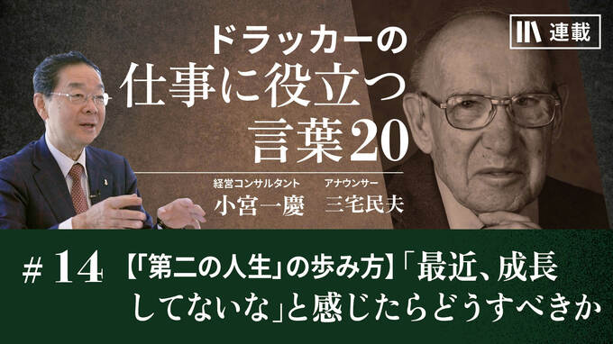 14話目にご紹介する言葉は、「「第二の人生」の歩み方」(『断絶の時代』より)。仕事に熱意を持てなくなった、成長の実感がない、という人はどうすればいいのでしょうか。転職や副業などで第二の人生を歩むことをドラッカーは勧めている、と小宮さんは解説します。小宮さん自身も、複数の会社を経て起業した人。ドラッカーは第二の人生を歩むコツについて、何と言っているのでしょうか?