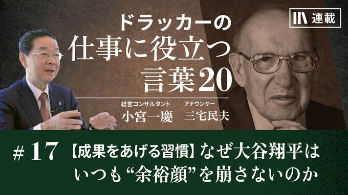 ドラッカーは成果をあげる習慣について、5つのポイントを挙げています。17話目にご紹介する言葉は、「成果をあげる習慣」(『経営者の条件』より)。成果をあげる習慣を実践している人に、メジャーリーグの大谷翔平選手がいます。ただし、大谷選手はどんな時も"余裕な表情"を崩しません。実はここに成果をあげる上で重要なポイントがある、と小宮さんは指摘します。