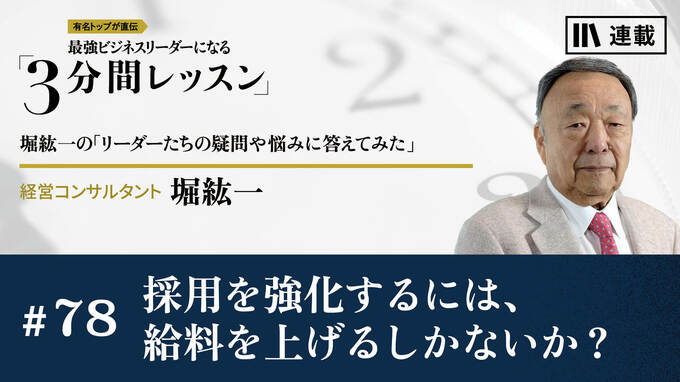 第78話 2023/10/16 月曜朝のエネルギー、レジェンドから見た未来 採用を強化するには、給料を上げるしかないか? 心のアップグレード 3分間レッスン マネジメント リーダーシップ 本連載では、“伝説のトップコンサルタント”堀紘一氏に、メルマガ編集チームがまとめたリーダーたちの悩みをぶつけ、ズバッと斬っていただきます。(2023年10月16日レター) 堀 紘一 経営コンサルタント 1945年、兵庫県生まれ。東京教育大学(現筑波大学)附属駒場高校(筑駒)、東京大学法学部を卒業。読売新聞社、三菱商事を経て、米ハーバード大学ビジネススクールでMBAを首席で卒業。81年、ボストン コンサルティング グループ(BCG)に入社、89年から日本支社社長。2000年6月にドリームインキュベータ(DI)を設立し、社長、会長を歴任。20年6月に取締役を退任。