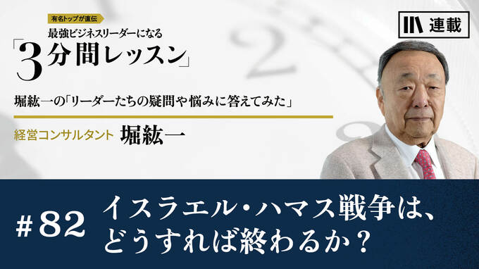 第82話 2023/11/13 月曜朝のエネルギー、レジェンドから見た未来 イスラエル・ハマス戦争は、どうすれば終わるか? 心のアップグレード 3分間レッスン マネジメント リーダーシップ 本連載では、“伝説のトップコンサルタント”堀紘一氏に、メルマガ編集チームがまとめたリーダーたちの悩みをぶつけ、ズバッと斬っていただきます。(2023年11月13日レター) 堀 紘一 経営コンサルタント 1945年、兵庫県生まれ。東京教育大学(現筑波大学)附属駒場高校(筑駒)、東京大学法学部を卒業。読売新聞社、三菱商事を経て、米ハーバード大学ビジネススクールでMBAを首席で卒業。81年、ボストン コンサルティング グループ(BCG)に入社、89年から日本支社社長。2000年6月にドリームインキュベータ(DI)を設立し、社長、会長を歴任。20年6月に取締役を退任。